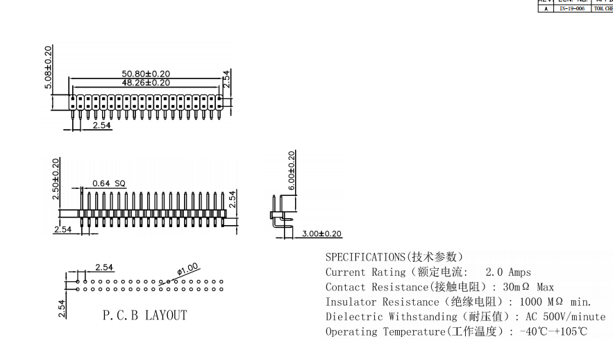 排針 單塑 2*20P 間距2.54mm 90度彎針數(shù)據(jù)手冊PDF下載