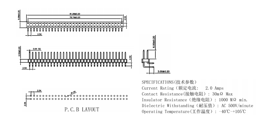 排針 單塑 2*32P 間距2.54mm 90度彎針數(shù)據(jù)手冊PDF下載