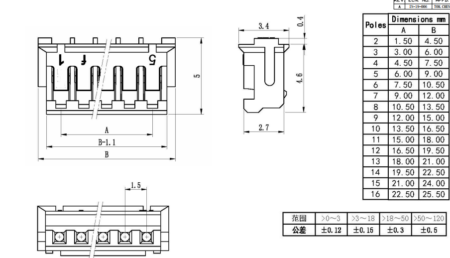 膠殼 1*5P 間距1.5mm 白色 數(shù)據(jù)手冊PDF下載