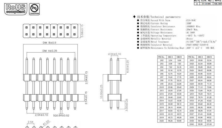 排針 雙塑 2*7P 間距2.54mm 180度直針數(shù)據(jù)手冊PDF下載