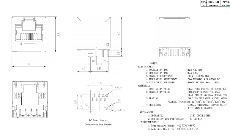 RJ45 Connector 1x1 Port 8P8C Without LED Vertical Module Jack數(shù)據(jù)手冊PDF下載